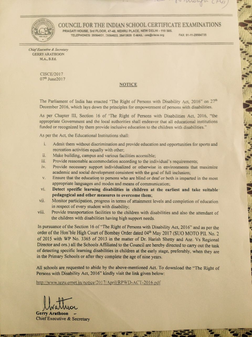 Circular issued by CBSE Board based on The rights of Persons with Disability Act , 2016 , to be implemented by all schools